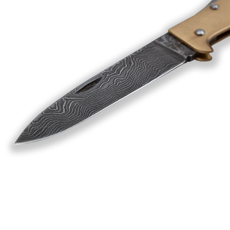 Das mattierte Messing und der ausdrucksstarke Damast lassen aus dem einst einfachen Arbeitsmesser etwas ganz besonderes werden.